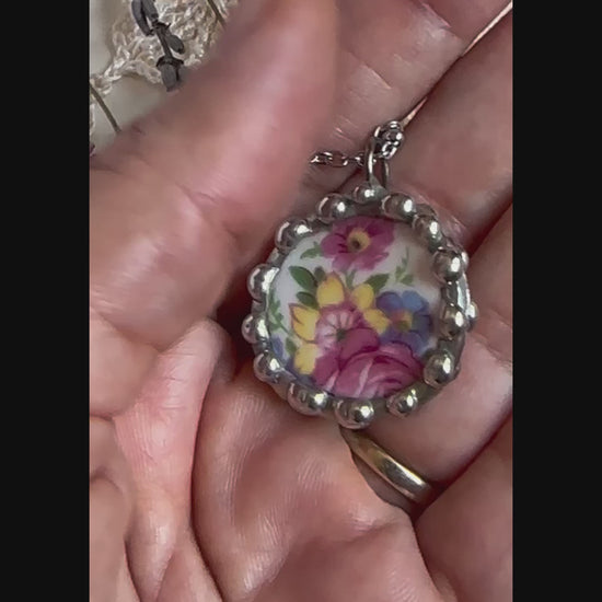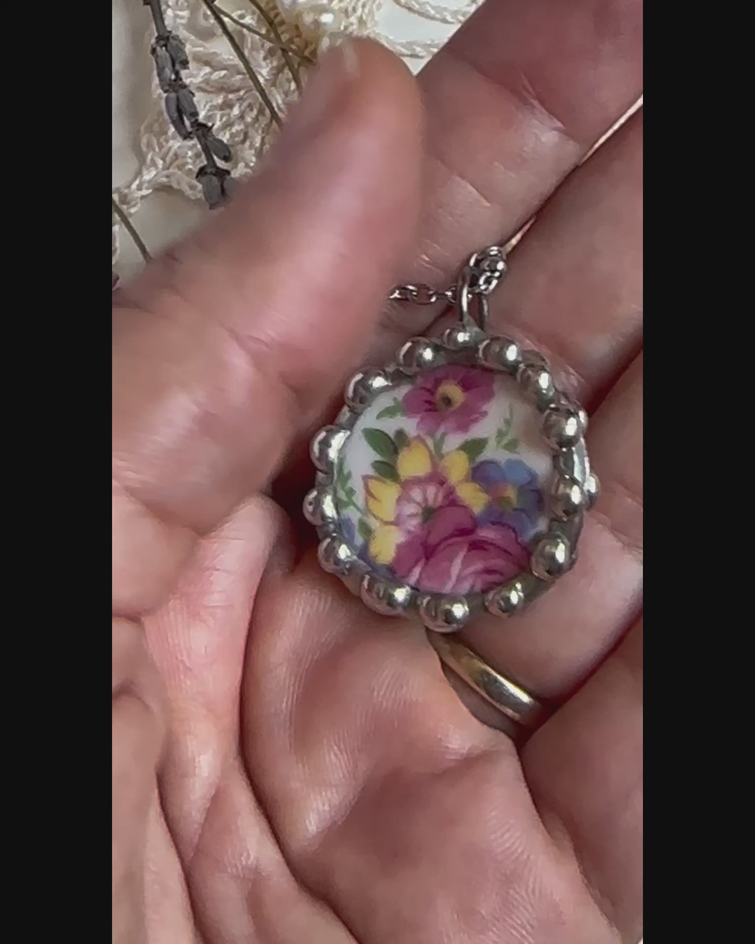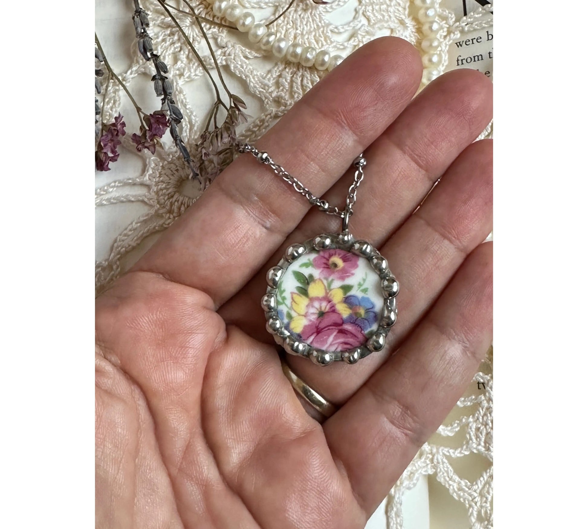 Please note that each piece of jewellry is made from a vintage plate, bowl or tea cup which means that there can be varied thicknesses and curves throughout the piece.