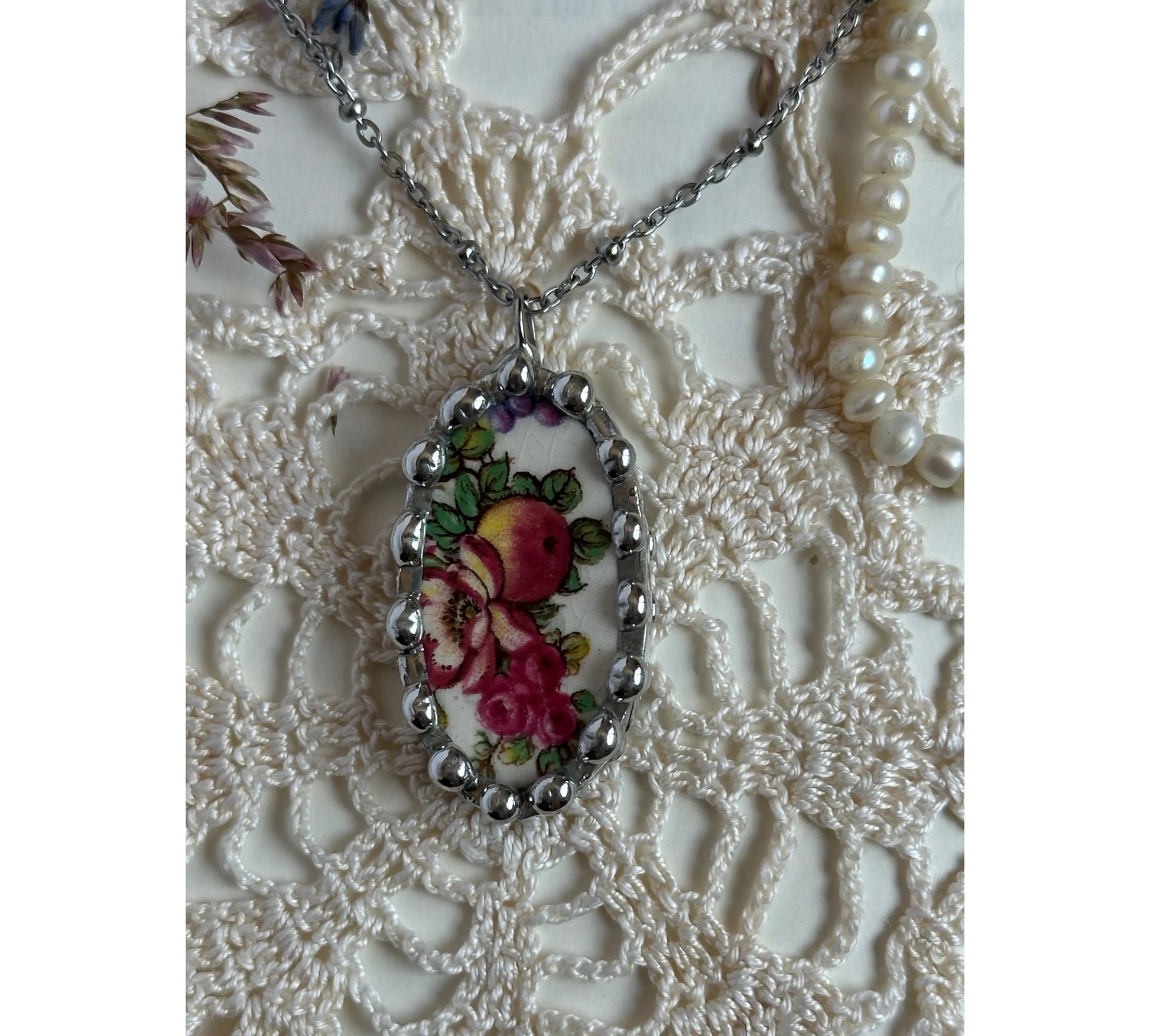 Please note that each piece of jewellry is made from a vintage plate, bowl or tea cup which means that there can be varied thicknesses and curves throughout the piece.