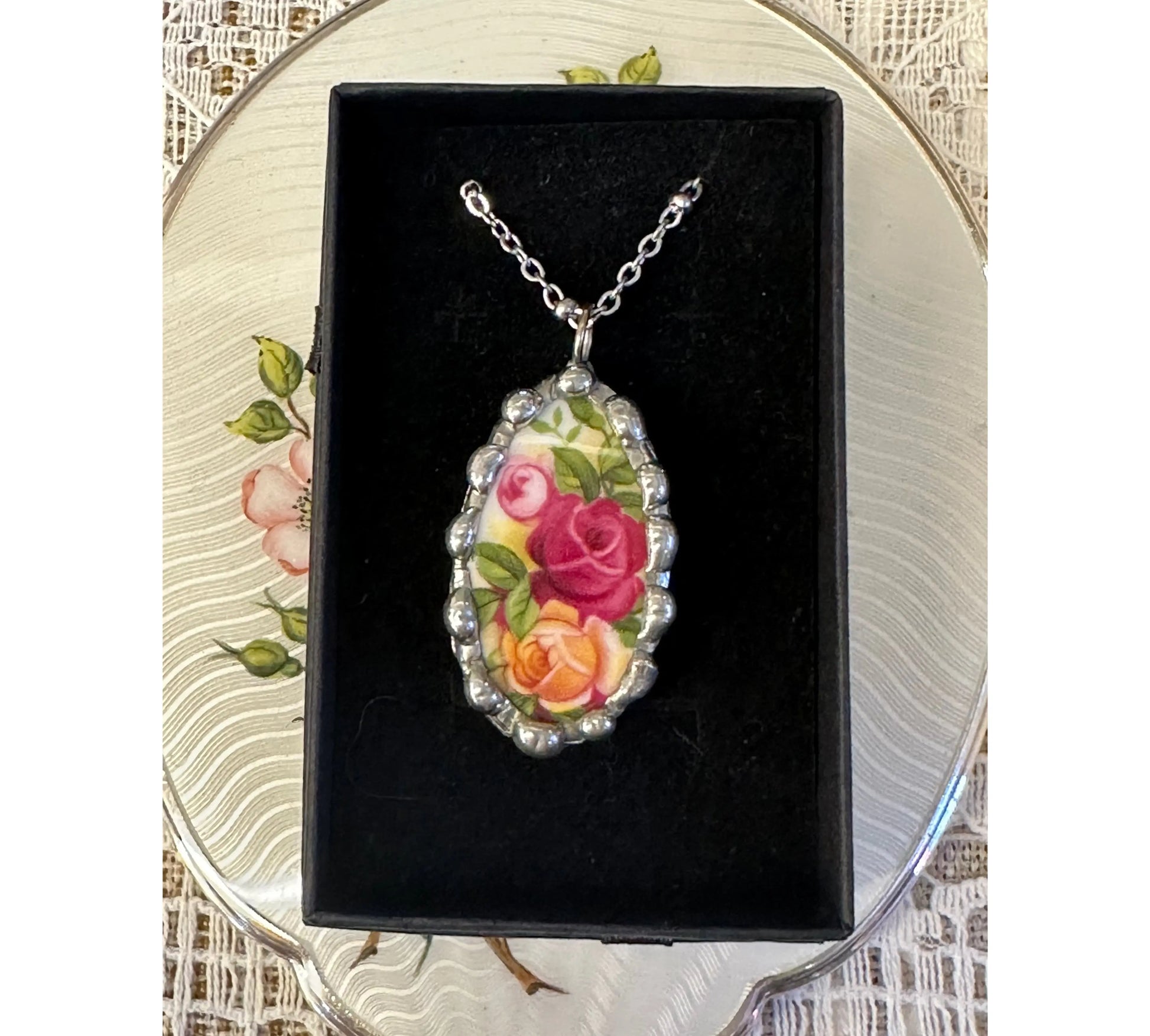 A vintage Royal Albert ceramic necklace with blooming roses. Oval shaped